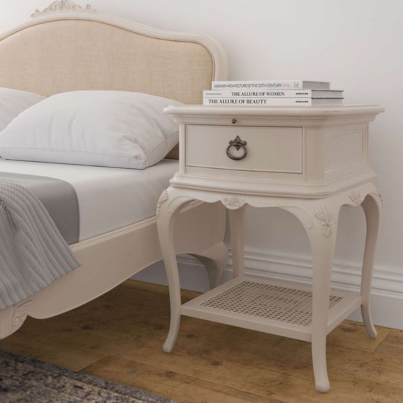 This elegant bedside piece brings a soft, romantic charm to your bedroom. Crafted from solid wood and finished with a gently distressed patina, it features delicate carved detailing and profiled edges that echo classic French design. A single dovetailed drawer offers practical storage for nighttime essentials, while the lower rattan shelf adds a light, airy touch, perfect for books or decorative accents. Finished with antique-style bronze hardware, its a timeless addition to any restful retreat.