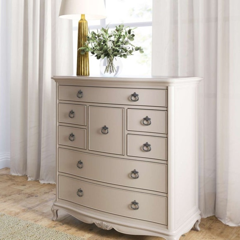 This beautifully crafted chest offers generous storage with a unique drawer configuration that adds visual interest and practicality. The soft painted finish is lightly distressed to highlight the carved detailing and gently curved edges, creating a look thats both elegant and lived-in. With eight dovetailed drawers and antique-style bronze hardware, this piece is perfect for organising everything from clothing to keepsakes, while adding a touch of classic charm to your space.