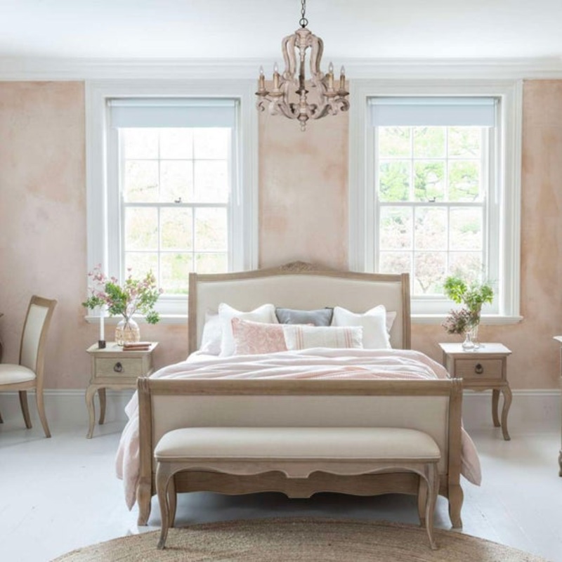 This beautifully upholstered bed frame brings a sense of understated luxury to your bedroom. The high headboard is padded and covered in a natural linen fabric, offering both comfort and elegance. Crafted from solid wood with a soft limed finish, it features sprung slats for enhanced support and durability.