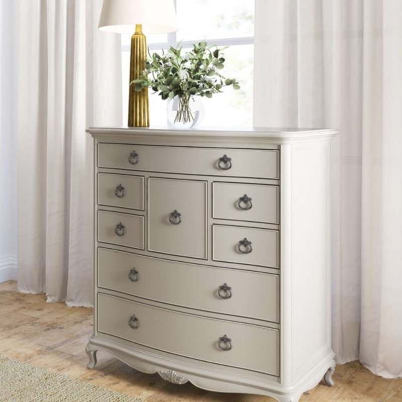 This elegant chest offers generous storage with a unique layout that adds visual interest to your room. Crafted from solid wood and finished in a soft, distressed tone, it features eight drawers, perfect for organising everything from clothing to keepsakes. The carved detailing and antique-style pewter hardware lend a classic French feel, while dovetail joints ensure lasting quality.