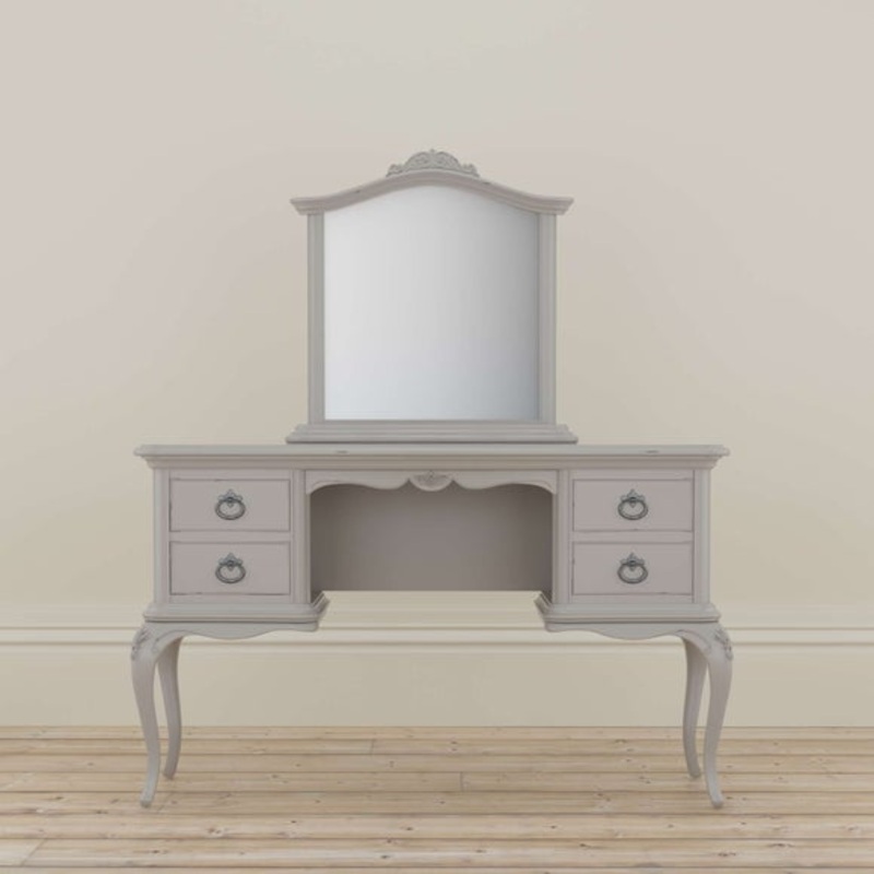 This graceful dressing table is a timeless addition to your morning routine. Featuring four drawers with dovetail joints and antique-style pewter handles, it offers ample space for beauty essentials and personal items. The soft painted finish is lightly distressed to highlight the carved detailing and elegant curves, creating a piece thats as beautiful as it is functional.