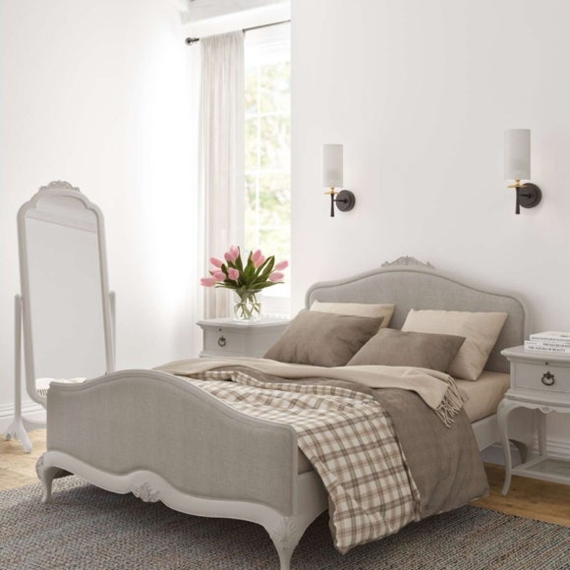 Solid poplar and Birch veneer frameSoft painted finishCarved detailingSprung slatted baseThis beautifully upholstered bed frame brings a soft, romantic feel to your bedroom. The headboard is padded and covered in a natural linen fabric, framed by carved wo
