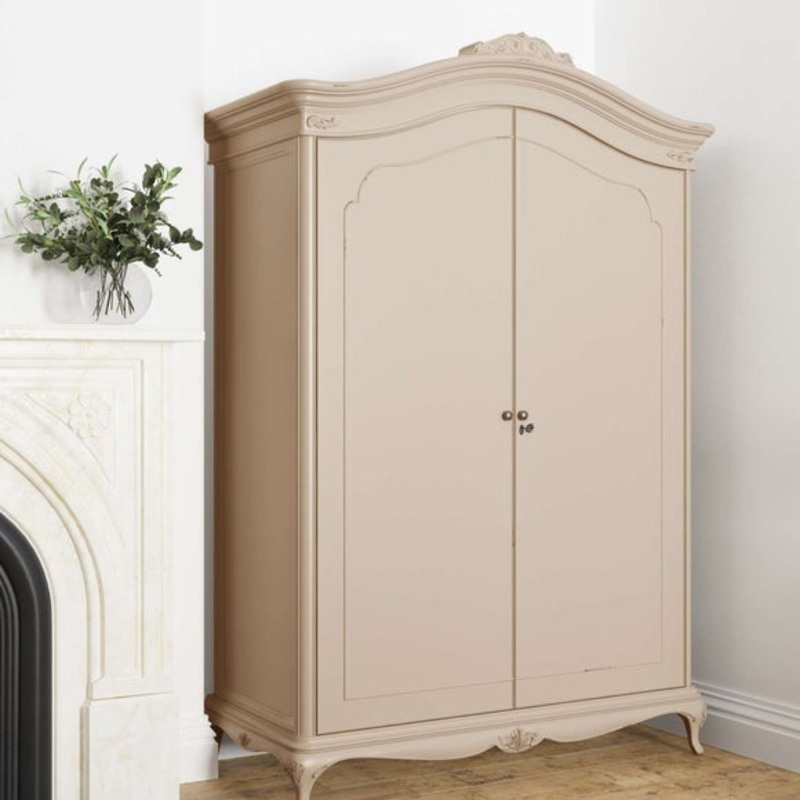 This spacious wardrobe is designed to adapt to your storage needs with a flexible interior layout. It features multiple hanging and shelving options, two tie racks, and a secure espagnolette locking system. The soft painted finish is gently distressed to highlight the carved detailing, while antique-style bronze hardware adds a refined touch.