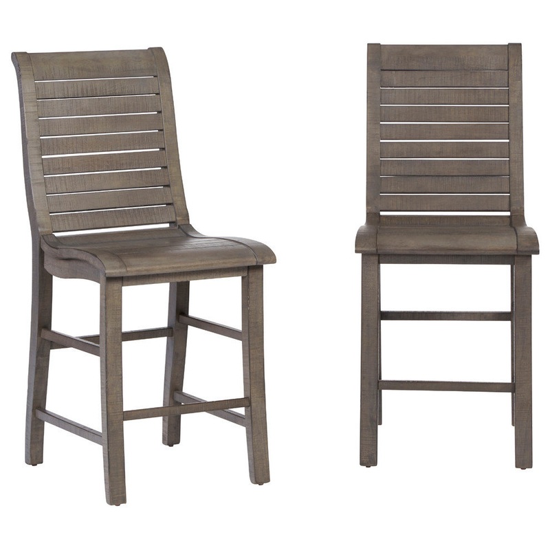 The distressed gray finish has the nature of salvaged wood. These chairs are constructed of Rubberwood solids and Pine veneers with a rough hewn detail. These counter chairs are all wood in a slat design.
