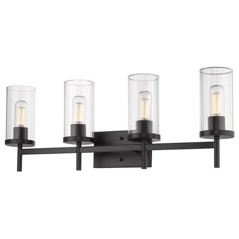 Golden Lighting’s Winslett collection is versatile and transitional in style. Classic silhouettes are perfectly matched with clean, modern lines for a mixture of form and function. Bright bulbs shine within ribbed clear glass shades. The linear texture, made by a glass-blowing technique, creates the optical illusion of distortion. The vertical lines in the glass provide gentle diffusion while playfully refracting light. Offered in two highly adaptable finishes; Pewter and Matte Black, the Winslett collection is suitable for a variety of decors. This 4-light bath vanity is UL approved damp locations.