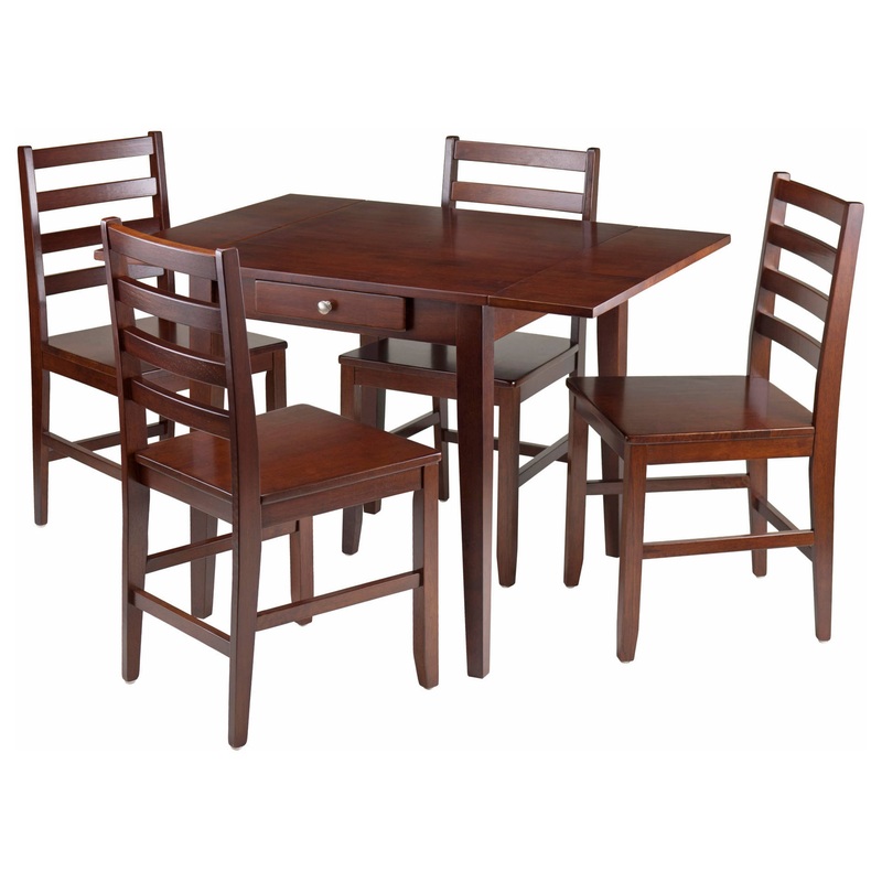 A double drop leaf table with tapered legs and four ladder back chairs with high backrest featuring slats design. This set brings comfort, function and style to your dining room. The dining table has a drawer for extra storage. Drawer dimensions 7.80???W x 8.98???d x 2.07???H. Top dimensions when fully opened 41.73???W x 30.55???D, dimensions with one leaf dropped 34.76???W x 30.55???. Ladder back Seat dimensions 16.54???W x 16.46???D x 17.06???H. Weight capacity of chairs is 220 lbs. Sturdy solid wood construction. Walnut finish. Ready to assemble