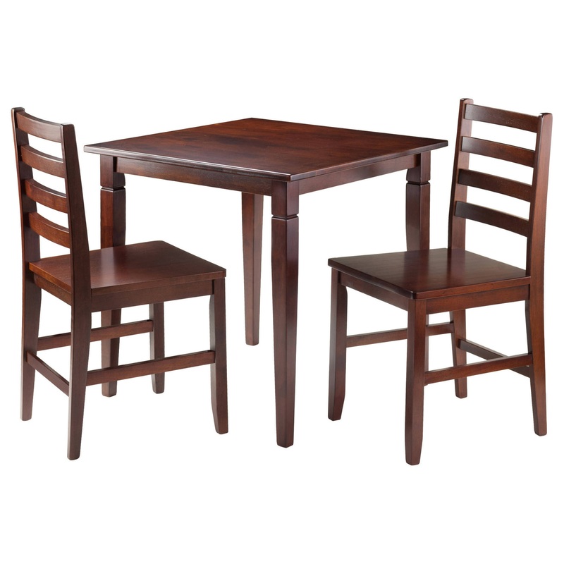 Enhance the look of your casual dining are with this sleek, comtemporary 3-Pc Kiingsgate Dining Table Set. Compact yet practical, this table offers ample space for dining or entertaining in any area of your home. Table dimensions is 29.53W x 29.53D x 29.13H. The set comes with 2 Hamitlon Ladder Back Chairs stands at 16.54W x 18.63D x 34.70H. Seat height from ground is 18 and Seat back height is 17.06. Seat dimension is 16.54W x 16.46D. Table and Chairs are made from real wood in warm walnut finish. Table and Chairs required assembly.