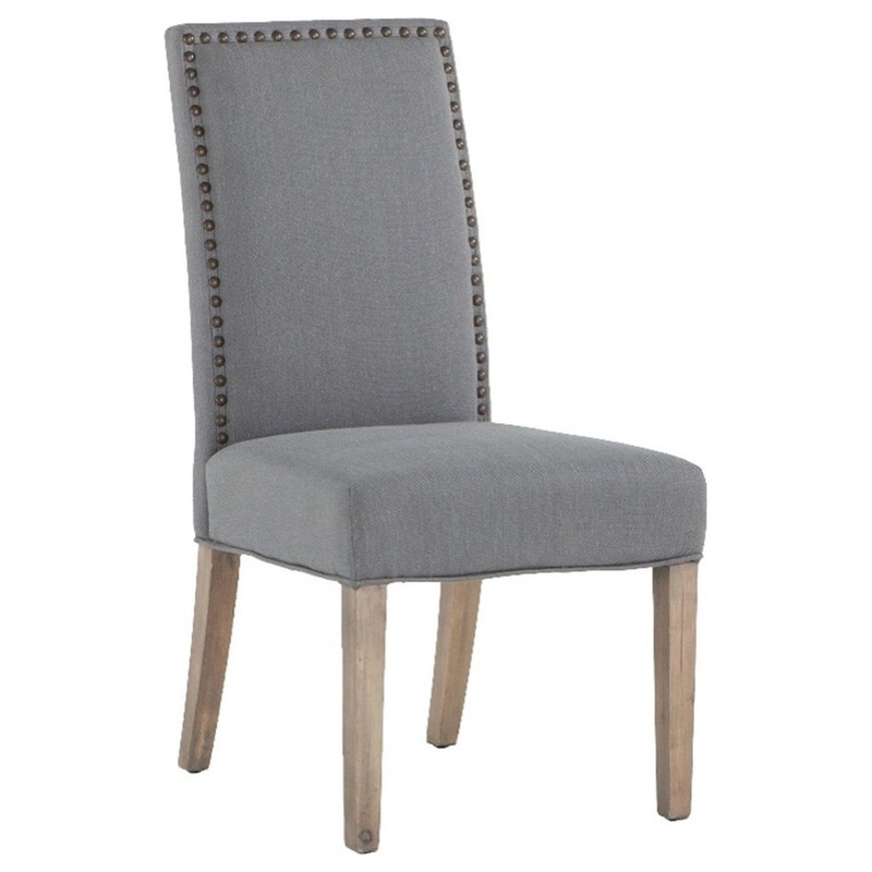 Bring a chic look to your kitchen or bar decor with the Jona collection of upholstered chairs. Our Jona collection brings comfort and casual elegance to any dining or kitchen area. Each chair in this collection boasts a solid hardwood frame upholstered in a linen, cotton and polyester blend fabric. This beautiful Jona high back dining chair is upholstered in a warm gray fabric with antique brass nailhead trim along the seat back. The natural, light brown Napoleon finish of the solid wood legs complement a variety of wood and metal finishes, while providing a more traditional look to any dining or kitchen space. The pre-assembled dining chair is ready-to-use and of the finest quality, making it an effortless addition to your home.
