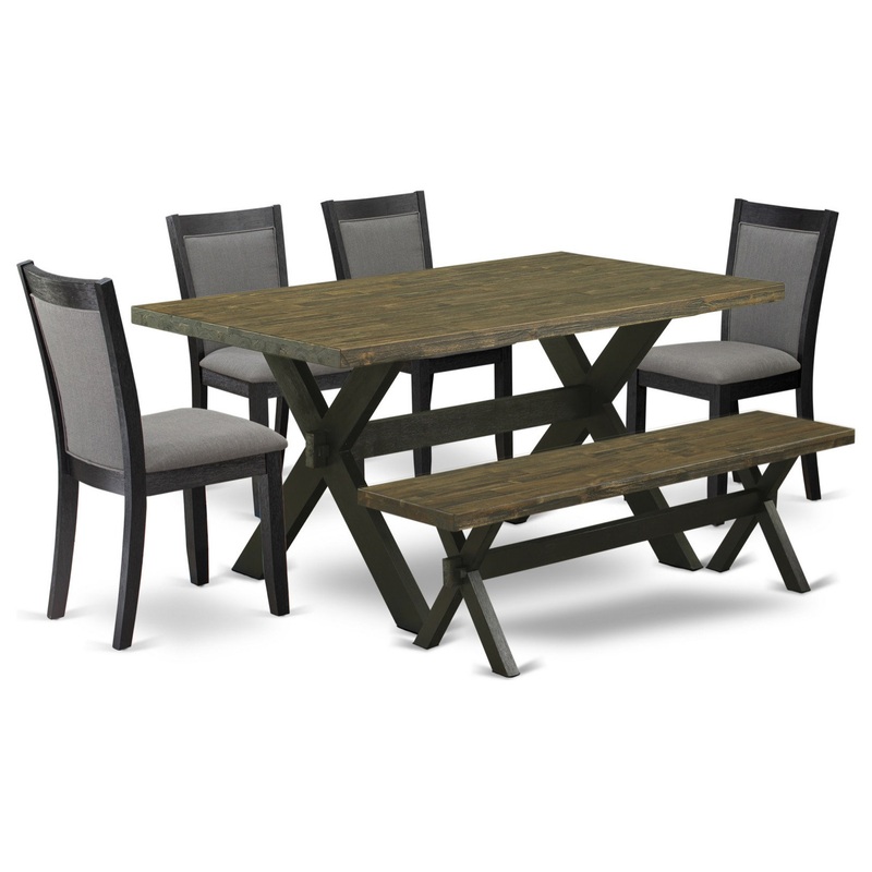 X676MZ650-6 6Pc Dining Set – Rectangular Table , 4 Parson Chairs and a Bench – Multi-Color ColorEAST WEST FURNITURE – X676MZ650-6 – 6 PIECE MODERN DINING SET; This 6 Piece mid century dining set includes a modern dining table, a small bench, and 4 matching kitchen chairs to make your family mealtime more comfortable as well pleasant. The frame of this dining table set is made of prime quality Rubber Wood, which offers fantastic strength and stability. The modern dining chairs are slightly and elegantly curved, expertly finished with the help of highly experienced carpenters. These wooden dining chairs seat offers linen fabric which is very soft and has strong spring elasticity, providing the best comfortable contact experience. The seat of the parson chairs is wide enough to make your seating comfortable. Linen Fabric wooden dining chairs add stylish intrigue to your dining room. This modern dining set stands on a sturdy hardwood frame with solid legs and a contemporary Wire Brushed Black finish. The rectangular modern dining table and bench for dining room table has Distressed Jacobean top with X-Style Legs. The matching color of the kitchen chairs with the rectangular dinner table and dining room bench brings a good contrast in any dining area. This beautiful dinette set is simple to clean with a damp cloth and will always offer fresh appeal. The worth mentioning is that the installation process of our luxurious modern dining table set is very simple and easy to operate. Each set comes conveniently flat packed with easy to follow directions and all essential equipment included. You only need to follow the steps in the manual to accomplish the assembly in a short time. You’ll love our dining room table set top quality, style, and affordability!; DINING ROOM SET