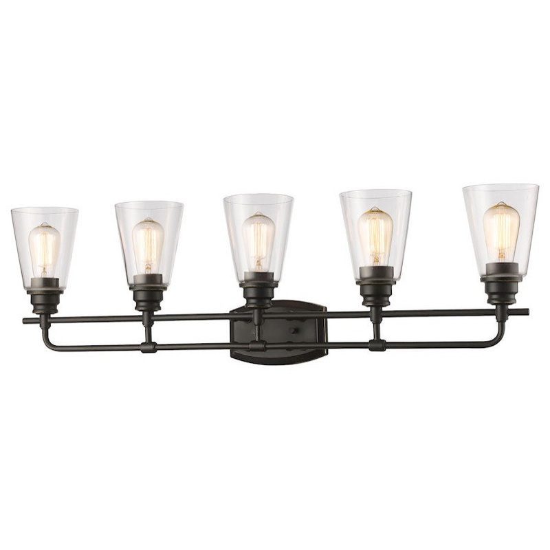 Harmony of vintage style fixture, clear glass, and vintage bulb shapes define the Annora family. Clear glass paired with olde bronze fittings complete the look. -Finish: Olde Bronze -Made of SteelShade Finish/Color: Clear -Shade Made of Glass -(5) 100W Med