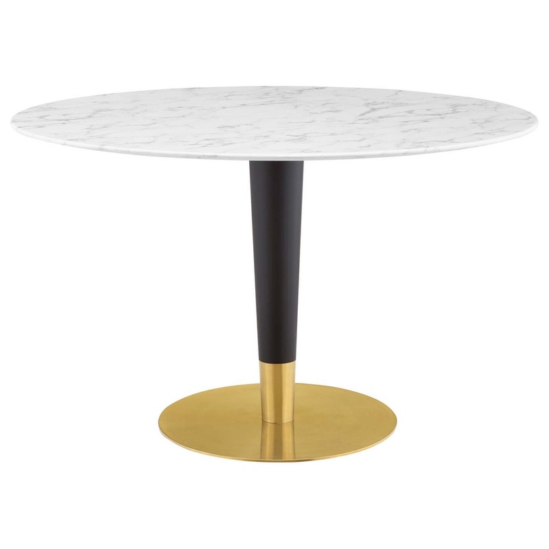 Gather family and friends for good food and conversation around the Zinque Dining Table. Bringing modern influence and mid-century inspiration to your dining space, this pedestal table reflects an organic shape. Perfect for entertaining or everyday dining, this dining table rests on a black and polished gold tapered base and features a 47″ artificial marble tabletop with an easy-to-clean coating. Non-marking ring to protect flooring. Assembly required.