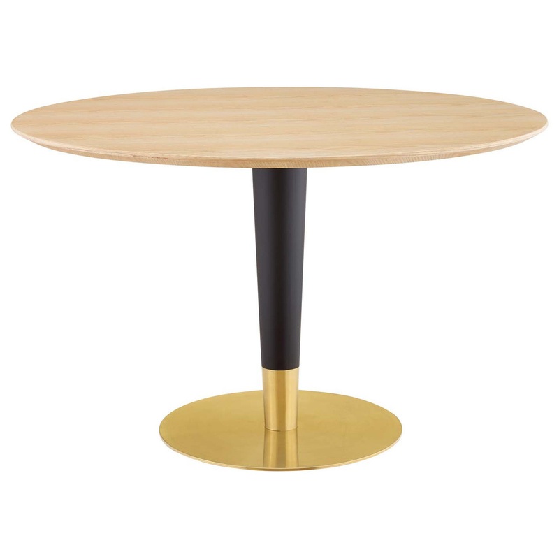 Gather family and friends for good food and conversation around the Zinque Dining Table. Bringing modern influence and mid-century inspiration to your dining space, this pedestal table reflects an organic shape. Perfect for entertaining or everyday dining, this dining table rests on a black and polished gold tapered base and features a 47″ circular tabletop crafted with MDF and an easy-to-clean wood grain veneer. Non-marking ring to protect flooring. Assembly required.